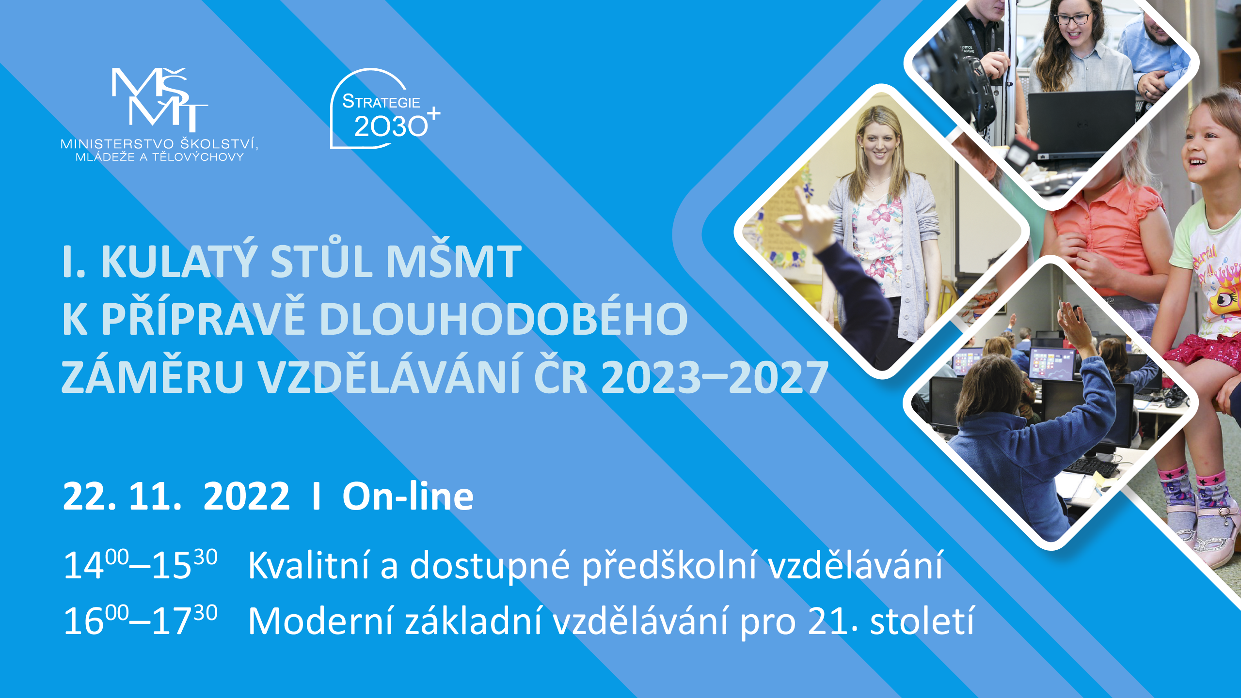 Ministerstvo školství, mládeže a tělovýchovy (MŠMT) Vás zve na první kulatý stůl k přípravě Dlouhodobého záměru vzdělávání ČR na období 2023-2027. Jde o on-line setkání, které se uskuteční v úterý 22. 11. 2022 odpoledne mezi 14:00-17:30, kde budou představeny a spolu s odborníky diskutovány návrhy opatření pro první dvě témata: předškolní vzdělávání a základní vzdělávání, a to včetně návaznosti na postup a plnění cílů Strategie 2030+.