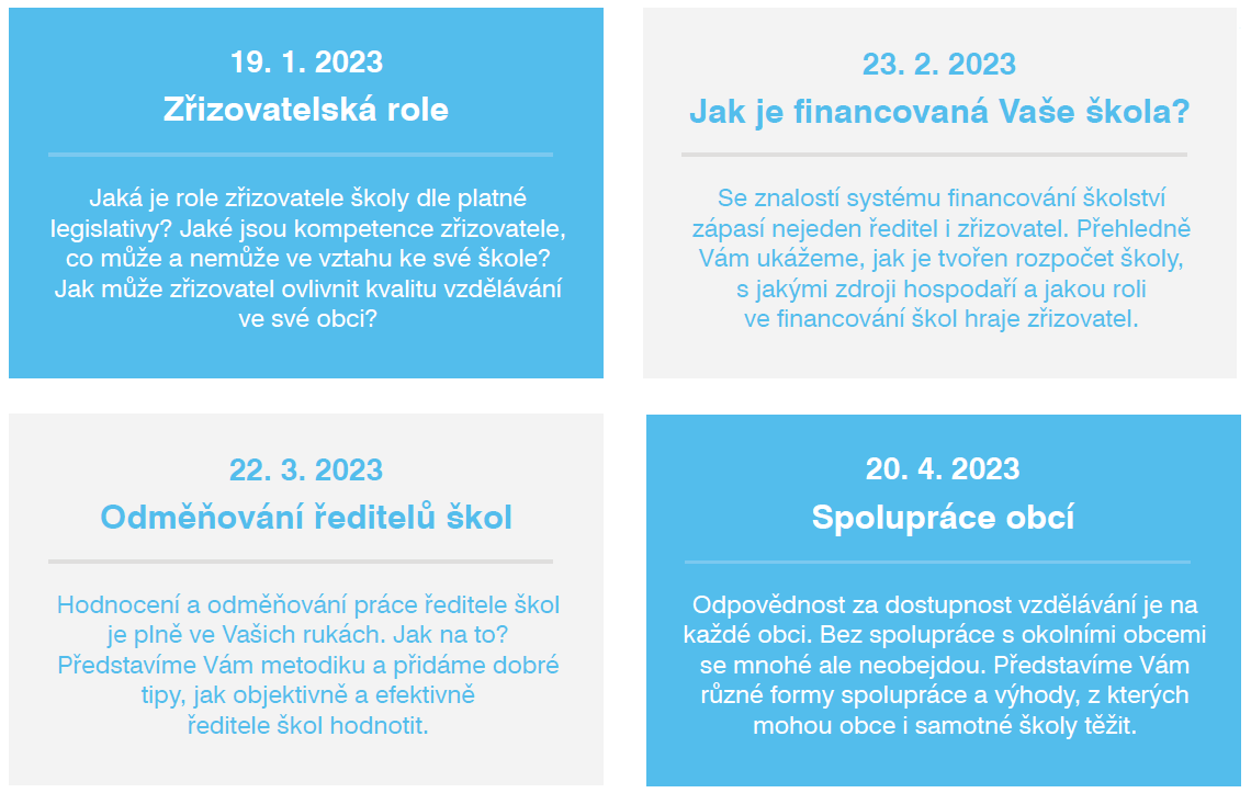 Střední článek podpory připravil pro zřizovatele škol cyklus vzdělávacích besed. Od ledna 2023 bude organizovat jednou měsíčně čtyři on-line setkání, která jsou určena jak pro nové zastupitele, tak pro ty, kteří již mají ve zřizovatelské roli zkušenosti. Budeme se na nich věnovat stěžejním zřizovatelským tématům, probereme konkrétní situace a odpovíme na dotazy účastníků.