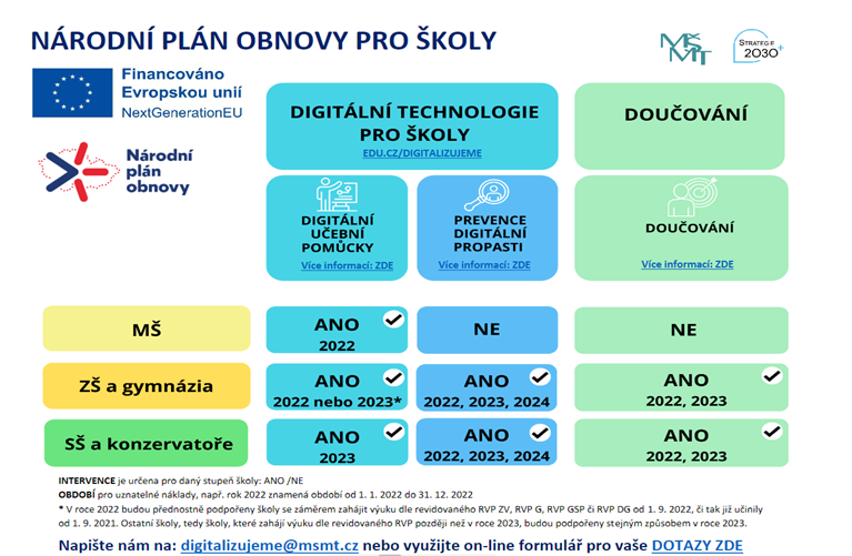 Národní plán obnovy obsahuje souhrn reforem, které mají napomoci oživení a podpoře odolnosti státních ekonomik. Celou společnost, a tedy i český vzdělávací systém čekají velké výzvy i příležitosti nejen v reakci na COVID-19, ale ve spojitosti s tzv. dvojitou – digitální a zelenou transformací. Evropská komise proto přišla s finančním nástrojem, díky kterému bude do školství směřovat cca 20 mld. Kč. V rámci komponenty 3.1. Inovace ve vzdělávání v kontextu digitalizace půjde do škol na digitalizaci cca 5 mld. Kč.