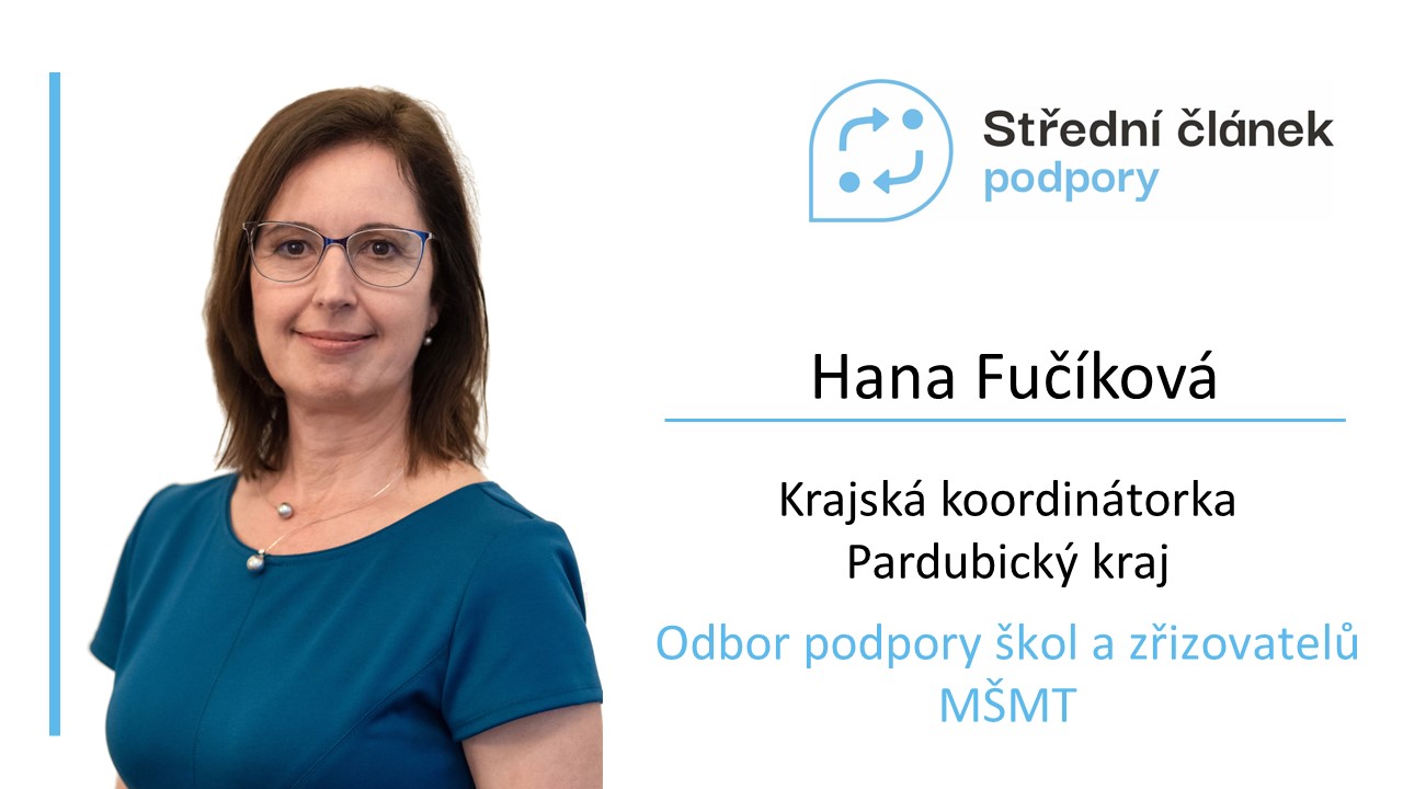 Hana Fučíková začala pracovat ve Středním článku podpory před dvěma roky jako koordinátorka v pilotním okrese Svitavy. Během této doby si vyzkoušela, jak střední článek působí na menším území, aby se nyní pustila do podpory škol a jejich zřizovatelů v celém Pardubickém kraji. Ředitelé z pilotního regionu ji tedy už znají. Vědí, že je umí podpořit kdykoli a v jakékoli oblasti. Dokáže poradit díky svým dlouholetým zkušenostem, znalostem i emotivnímu přístupu.