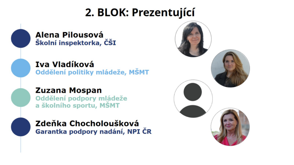 S dalším příspěvkem vystoupila Zdeňka Chocholoušková z NPI ČR, která přítomné seznámila s aktivitami zaměřenými na rozvoj podpory pro pedagogické pracovníky v oblasti identifikace a podpory nadání: