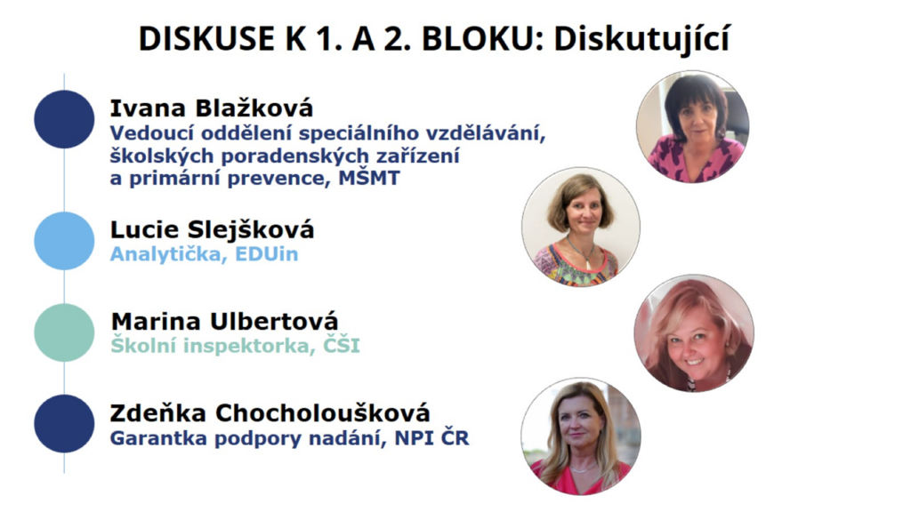 Po jednotlivých prezentacích následovala panelová diskuse, které se zúčastnily Ivana Blažková (MŠMT), Lucie Slejšková (EDUin), Marina Ulbrechtová (ČŠI) a Zdeňka Chocholoušková (NPI ČR). Všichni přítomní se shodli, že pro podporu dětí a žáků jsou nejdůležitější motivovaní učitelé a ředitelé. Zásadní je pak systémově vytvářet vhodné prostředí motivace pedagogických pracovníků, a to jak finančními a legislativními nástroji, tak i prostřednictvím metodické podpory. Důležitá je také motivace škol a školských zařízení, které nyní nadané děti a žáky neidentifikují a nepodporují, aby se tématem více zabývaly.