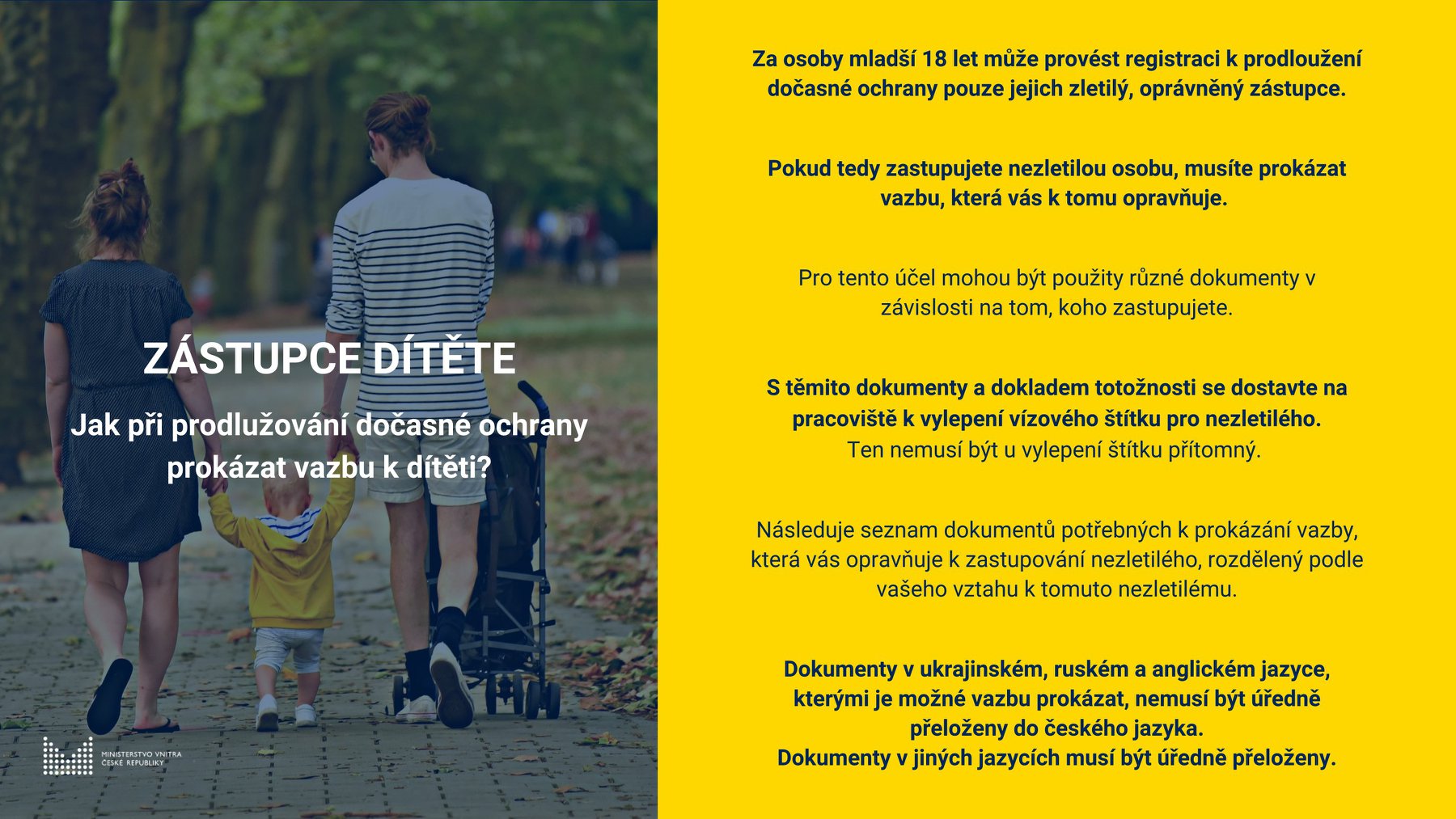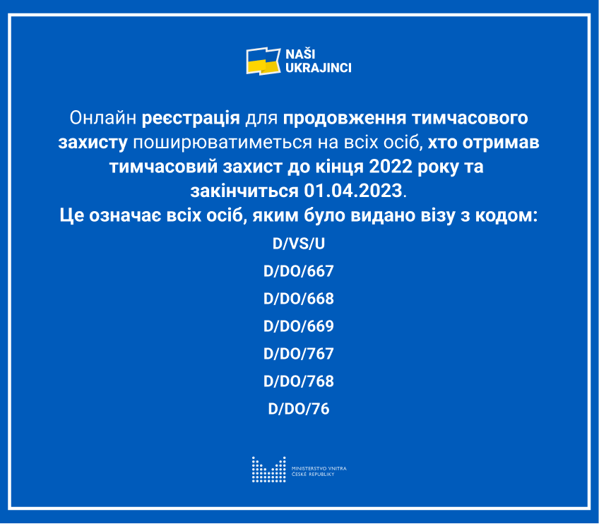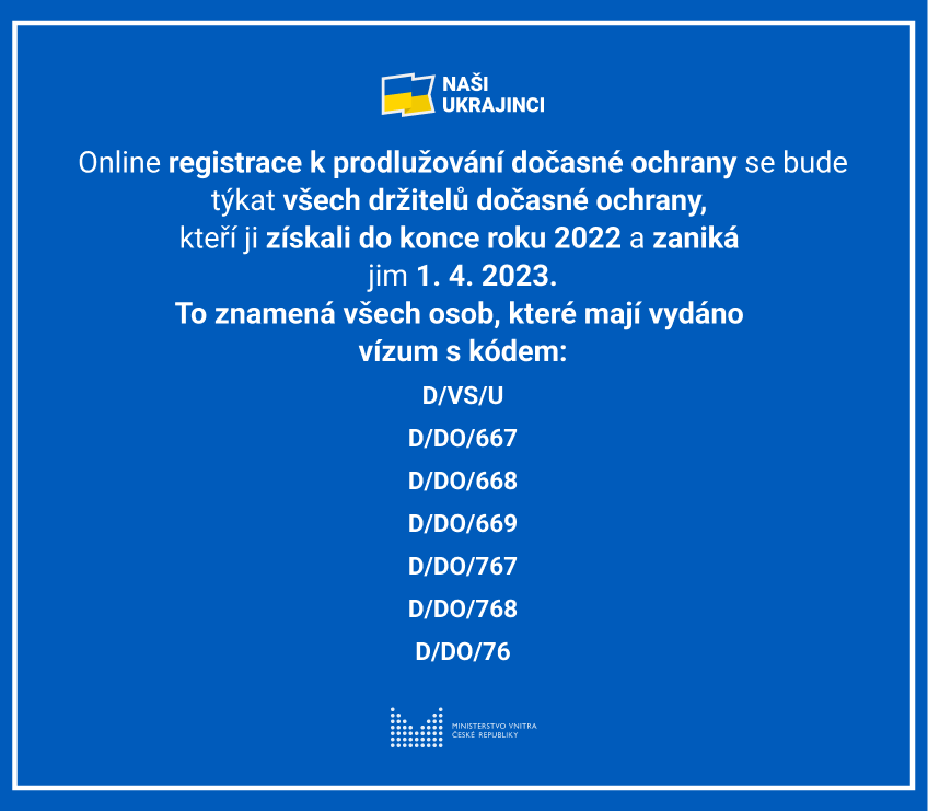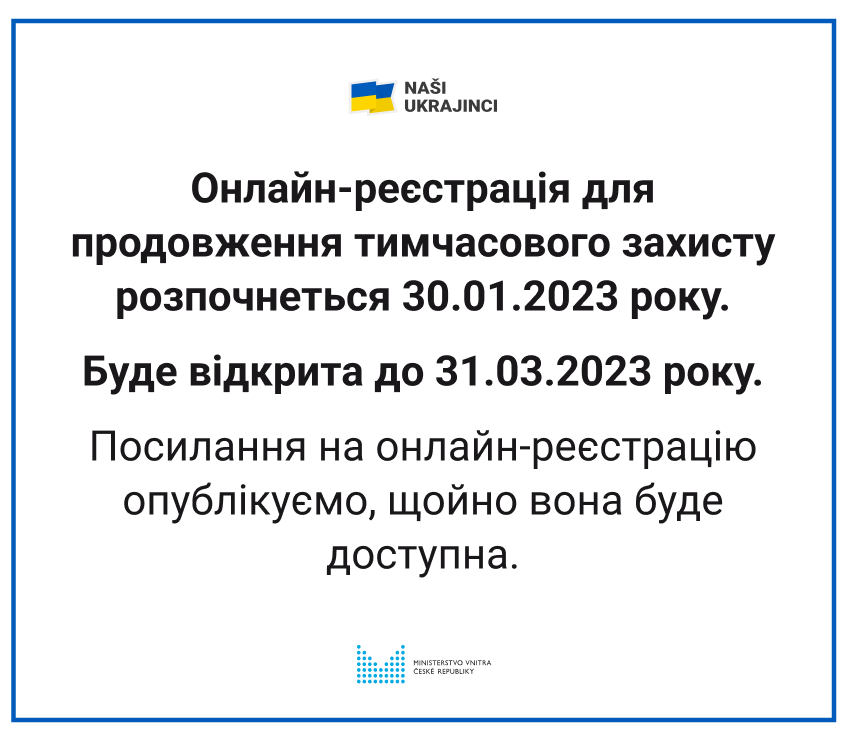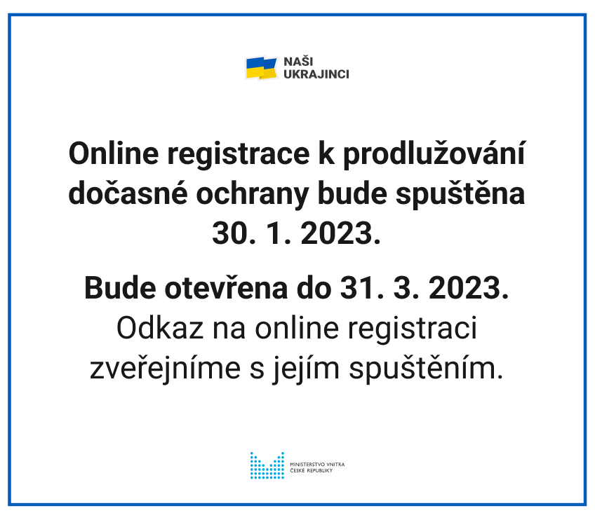 Ministerstvo vnitra České republiky dne 30. 1. 2023 spustilo na Informačním portálu pro cizince online registraci pro prodloužení dočasné ochrany: https://prod.frs.gov.cz/docasna-ochrana/?fbclid=IwAR2nL0b4rIuS3smQgDOB9S6ELgNvI6TlgEcZ6KoDmULxPlutqhCUNH1u0Vw