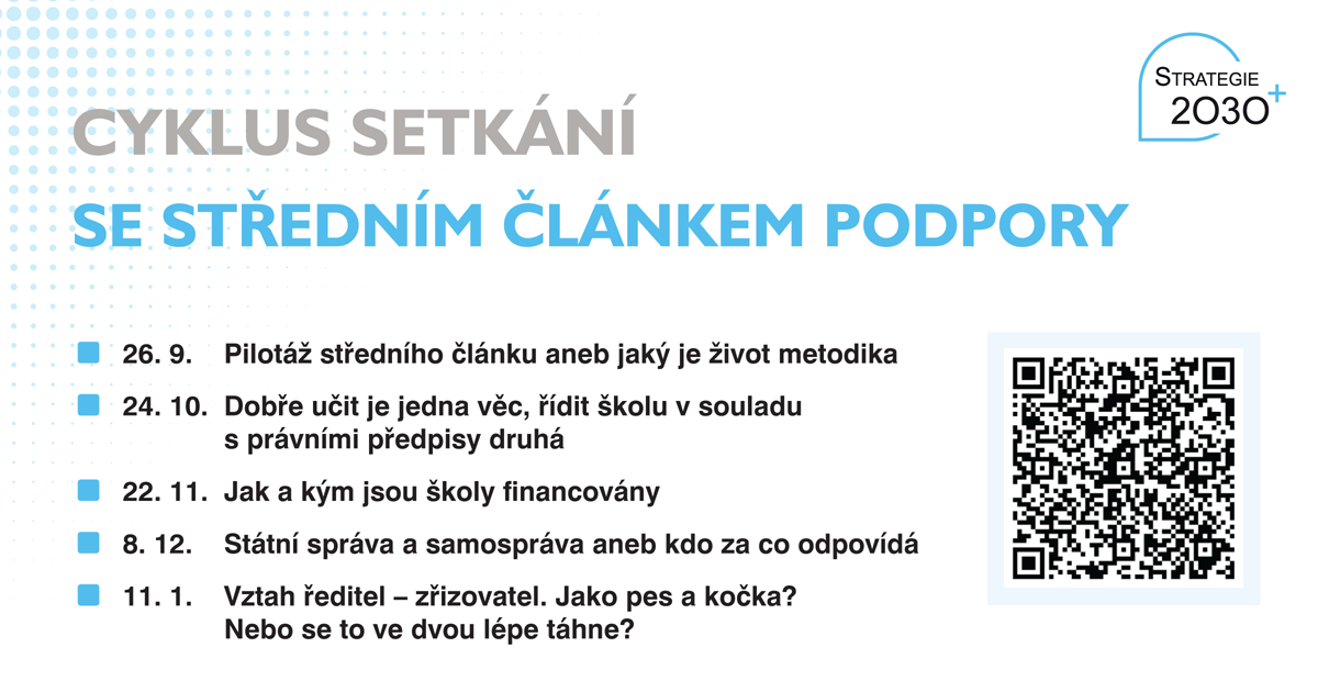 První setkání proběhne 26. září a jeho obsahem bude pouze střední článek. Následující akce zaměříme na důležité oblasti pro fungování škol a zároveň vždy shrneme aktuality ke střednímu článku a přípravy na celostátní působení.
