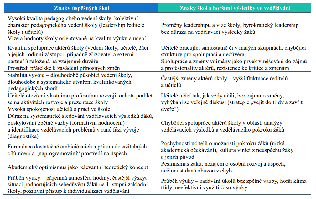 Následující tabulka je shrnutím znaků úspěšných škol tak, jak byly identifikovány v navštívených školách. Pro lepší zachycení jejich podstaty jsou dány do kontrastu s typickými znaky škol s horšími výsledky ve vzdělávání.